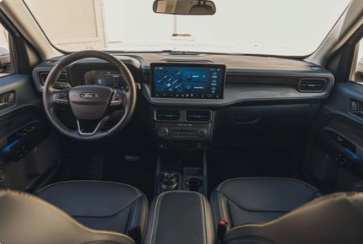 O interior da Ford Maverick Tremor reflete a modernidade e o cuidado com a ergonomia e a tecnologia. O sistema multimídia Sync, agora com uma tela de 13,2 polegadas, é um dos destaques. Compatível com Android Auto e Apple CarPlay sem fio, oferece uma interface intuitiva e conectividade rápida, essencial para o dia a dia. A qualidade do acabamento interno, embora predominantemente em plástico, recebeu um toque de refinamento nesta reestilização, demonstrando a atenção da Ford aos detalhes.